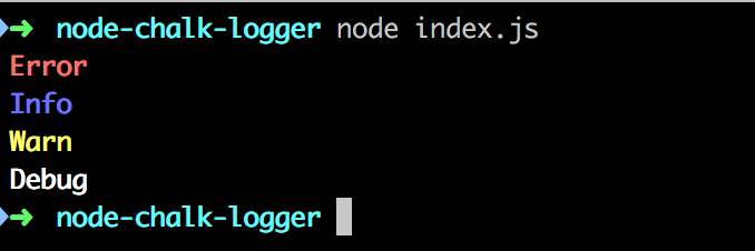 const error = chalk.bold.red const info = chalk.bold.blue const warn = chalk.bold.yellow const debug = chalk.bold.white
