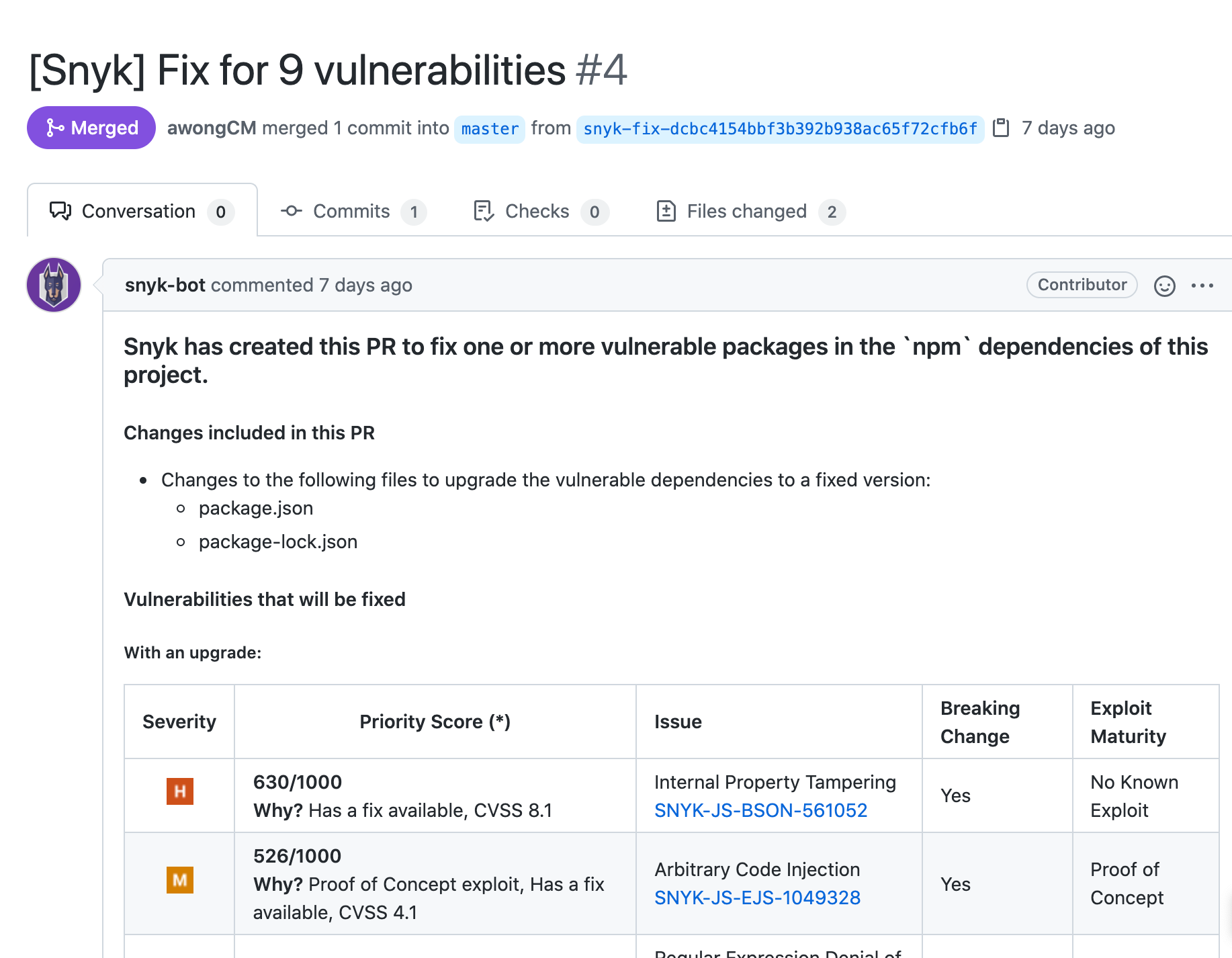 Here you can see a table generated by Snyk outlining explanations of which files suffered security vulnerabilities and came up with recommended fixes for these.